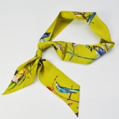 该飘带丝巾以12姆米真丝斜纹绸为面料,双层双面设计,以黄绿为主色调,描绘了一幅春日草木葱郁,繁花绽放,人间芳菲引得雀鸟争鸣的景象。来吧,将轻盈灵动的春天戴在身上!时尚又吸睛的飘带丝巾造型百变,创意无限,美由“我”来定义。