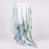 该丝巾以16姆米真丝素绉缎为面料,图案采用先进的数码喷印技术,密针手工卷边工艺精制而成。画面犹如一幅江南水乡的晨雾图,一切都笼罩在这飘渺朦胧的晨雾中,不喧不闹的“小桥流水人家”是人人心中依恋的梦里水乡。