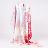 该款丝巾以100%天然桑蚕丝为原料,面料品种为素绉缎,纯手工精致卷边。桑蚕丝是天然的动物蛋白质纤维,有“纤维皇后”的美誉。丝质细腻柔软,手感顺滑,富有光泽。以中国传统吉祥图案“百鸟朝凤”为主题装饰,玫红色泽亮丽明快,具有祈福求安、幸福美满的寓意,亦可作为婚嫁馈赠礼品。