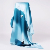 该丝巾以16姆米真丝素绉缎为面料,图案采用先进的数码喷印技术,密针手工卷边工艺精制而成。丝巾色调呈蓝灰色,画面的设计充满东方禅意的平和与宁静。禅悟之道,贵在明心,心若无尘,便可安然喜乐。