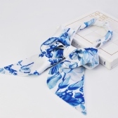 该飘带丝巾以14姆米真丝斜纹绸为面料,双层双面设计,一面素白至浅蓝渐变,一面在素白底上印制青花木兰图,木兰花幽姿淑态,素雅纯洁,青花的水墨晕染更衬得她恬淡有韵致。时尚又吸睛的宽飘带丝巾造型百变,创意无限,美由“我”来定义。