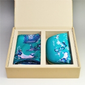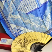 该款套装丝巾以5A级100%桑蚕丝为原料,采用台版印花、天然环保活性染料、手工卷边等优良工艺精制而成。折扇出自中华老字号杭州名扇“王星记”,质地精良,工艺考究。两者分别以“兰亭雅趣”和“幽兰吐香”为主题,将青花之素雅沉静、水墨之意境悠远精彩呈现,同时传递出文人儒雅风流、品性卓然的风范。