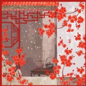 “晚来天欲雪,能饮一杯无。”该丝巾以14姆米真丝素绉缎为面料,图案采用先进的数码喷印技术,密针手工卷边工艺精制而成。画面撷取大雪时节,窗外雪花飘落、红梅绽放,室内茶炉、酒坛已备,此时无声胜有声,充满温馨动人的意味。
