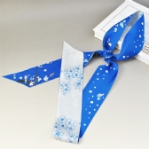 该飘带丝巾以12姆米真丝斜纹绸为面料,双层双面设计,高贵典雅的宝蓝色“梅雀争春”工笔花鸟画与清新淡雅的青花“梅花簇簇”线描画,两种风格和谐共存。时尚又吸睛的飘带丝巾造型百变,创意无限,美由“我”来定义。