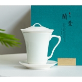 该茶杯以闻名遐迩的德化玉瓷为材质,瓷质高洁莹润、细腻白净,内外壁分别着透明釉、哑光釉。享有外观设计专利,器型简约秀美,容量适中,青花莲荷图清新素雅,浓淡相宜,品茶之余亦能养清心。