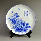 该款赏盘以目前国际上公认的高档瓷种——骨瓷为瓷体,瓷质细腻白净,釉色晶莹亮丽,花面“青花牡丹图”采用釉上彩的装饰技艺精制而成。牡丹为“百花之王”,同时以咏牡丹的名诗题款,置于案头可装点生活,可不时欣赏这宁静含蓄的东方之美。