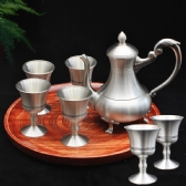 这是一款纯锡酒具套装,含锡量在97%以上,色如银,亮如镜,声如磬。锡器素有“盛酒酒甘醇”之美誉,夏天盛酒清凉爽口,冬天温酒导热快。该套锡器酒具器型高贵古朴,色泽沉稳含蓄,纹饰至简至奢,折射出一种“不怒而威”的王者风范。